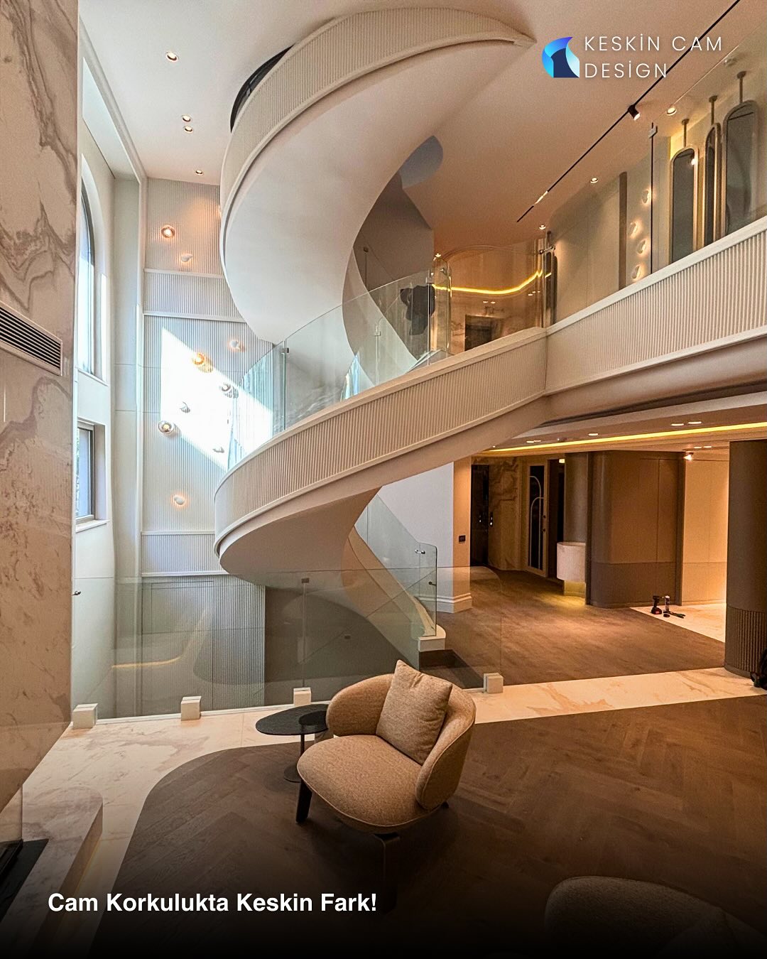 Kavisli mimariye özel bombeli cam korkuluklar, yüksek dayanım ve estetik sunar.